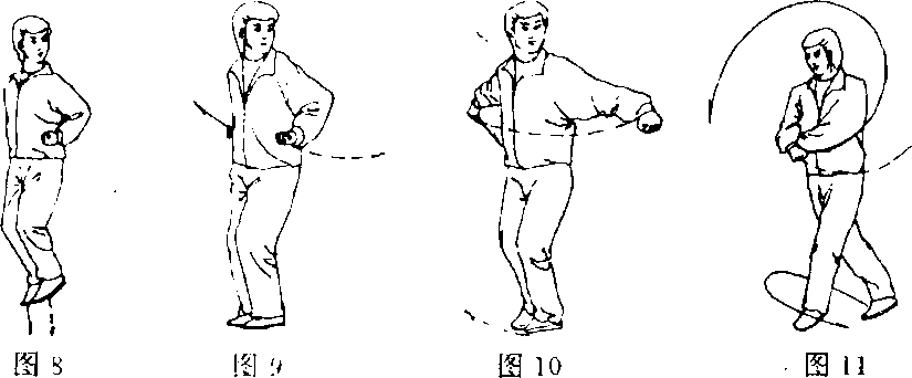 ①两臂微微向两侧自然摆动;左脚向右前方上步,脚尖外 展,两膝微屈;同时,左拳变掌与右拳同时摆至腹前交叉,右拳 在外;目视右拳(图10、ll)o