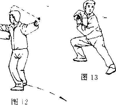 ②右脚从后向左前方上 步,脚尖外展,两膝微屈;同 时,右拳经上摆至右侧平举, 拳心朝下;左掌经下摆至左侧 平举,掌心朝下;目视右拳; 左脚向左前上步,脚尖朝左, 两腿屈膝成半马步;同时,右 拳屈肘向胸前平摆,拳眼朝 上;左掌经上摆至右侧胸前, 掌指朝上,掌心与右拳面相 对;目视左侧(图12、13)。