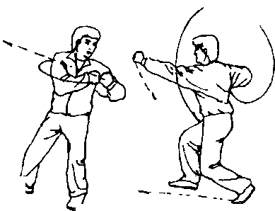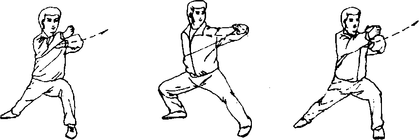 由左弓步转半马步时腰微向右转,再变左弓步时,腰再微左 转,有利于弓步冲拳的发劲。