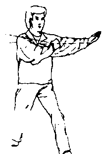 ①左脚向前踏一小步;同时,左掌右拳向左侧平摆,右臂屈 肘置于胸前,拳眼朝上,左臂摆至左侧平举;目视左侧(图 17)0