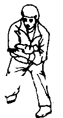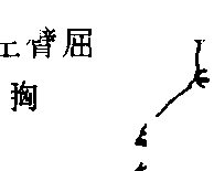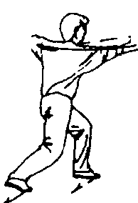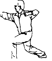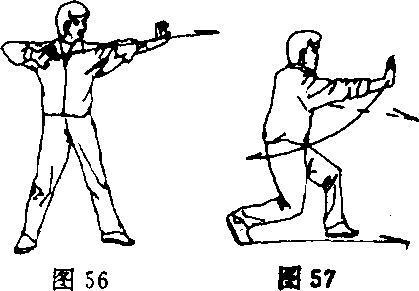 右腿屈膝内扣下跪,右脚跟离地,左腿屈膝成骑龙步,同时 腰微左转;两虎爪变掌,右掌前推,掌指朝上,臂与肩平,左掌 后收护于右上臂内侧,掌指朝上;目视前方(图57及侧面图)。