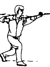 ②左脚向前上步屈 膝,右腿内转屈膝跪 沉,右脚跟离地,同时 < 腰微左转;右拳向前直 冲,拳眼朝上,左臂屈 肘,左拳收至左胸前,/ 拳眼朝上;目视右拳s (图55及反面图)。