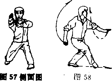 ①右脚向前上步,同时左掌向前伸出, 掌心朝前,右掌自然经下向后抡摆;左脚继 续向前上步,两臂继续经下向右上方抡摆 (图 58、59)。