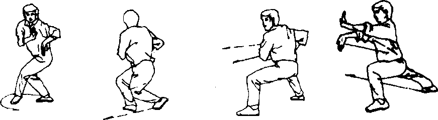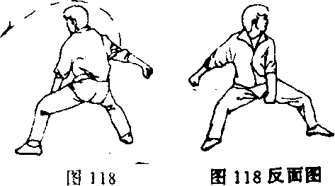 ①左脚向左侧上步,脚尖朝左,两腿屈膝,同时腰微左转; 左臂内旋,左拳由上向右下抄挂;右拳自然下落;目视左侧(图 118及反面图建