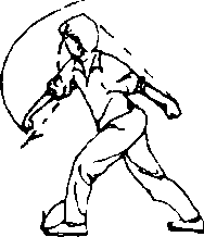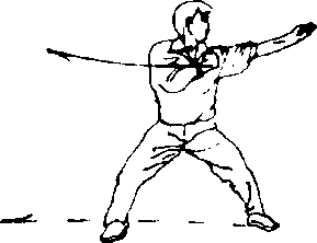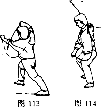 身体左转,左脚向左前上步,右脚略向前跟步成左弓步;同 时,右拳由上经下向左上方抛起;左拳经下向左后抡摆;目视右 前方;同时发“嗨”声(图114、115)。