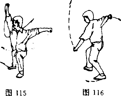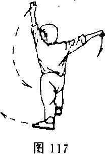 身体右转,右脚向右前上步,左脚略向前跟步成右弓步;同 时,右拳由上经下向右后抡摆,左拳由后经下向右上方抛起;目 视左前方(图116、117)。