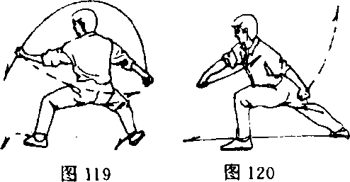 ②重心左移,腰微左转;同时,左拳继续向右经上向左侧反 挂,左腿屈膝,右腿伸直成左弓步;同时,左拳继续反挂至左后 侧,奉心斜朝里,右拳由后经上向前抡盖,拳心斜朝里;目视右 拳(图 119、120)。