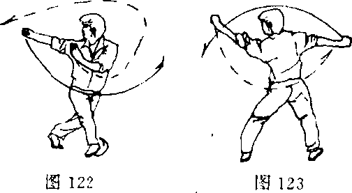 ①身体向左后转约180度;同时,左掌变拳随体转经下向左 上反臂抡挂,拳心斜朝上,右拳随体转经下向右抡摆,拳心朝 上;目视左拳(图123)。