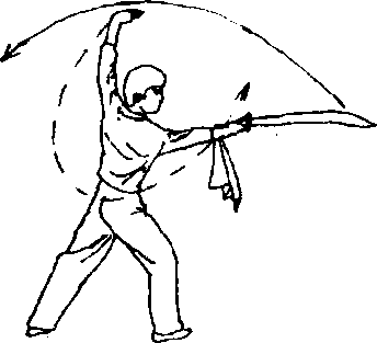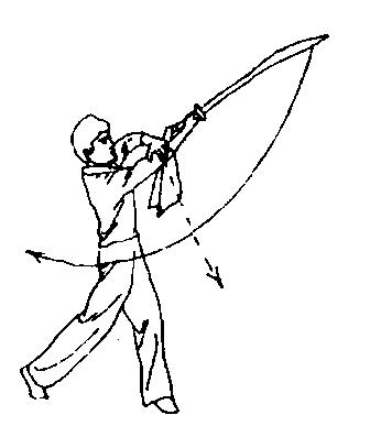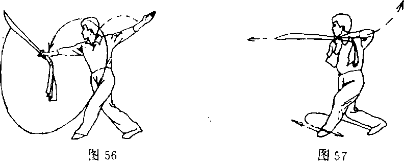 ①上体左转,两腿交叉;右手持刀直臂向上、向左绕行,以 腕为轴向下经右臂内侧立圆绕行一周后屈肘抱刀于胸前,刀刃朝 上,左手向左、向下沿身体左侧向左后方绕行屈肘按于右手上; 目视刀身(图56、57)o