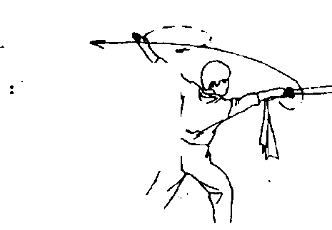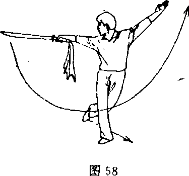 ②右脚经左腿前向左侧盖 步,随即左脚蹬地向右侧摆 起;右手持刀向右侧立刀扎 出,左手向左伸出;目视右前 方(图58)O