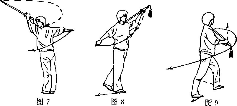 ④上体继续右转约90度;随转体右脚继续向右碾转,左脚 稍后退,脚尖点地;左手持剑在头上方云剑一周,位于体前,稍 高于头,手心向上,右剑指随转体继续右摆,位于体后,与腰同 高,手心斜向下;目视前方(图8)。