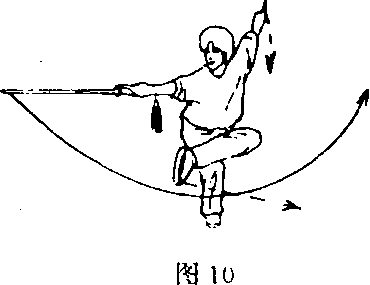 ②上体右转;右脚尖外撇, 重心移至右腿,屈膝半蹲,左脚 盘于右大腿上;右手握剑随转体 向右截剑,与胸同高,手心向下, 左手剑指向后平展,稍高于头, 手心斜向下;目视剑尖(图10)。