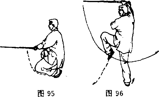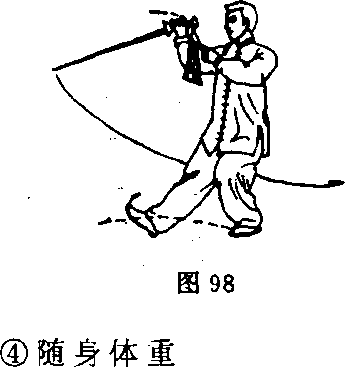 腕,左手剑指仍附于右前臂内侧,手心朝右;目视剑尖(图 98)。