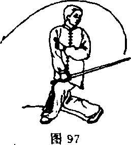 ①左脚向左摆步,随身体重心前移,右脚跟提起,上体略左 转;同时,右手握剑向左下方划弧挂剑,手心朝内,左手剑指屈 肘附于右上臂内侧,手心朝外;目视剑尖(图97)。