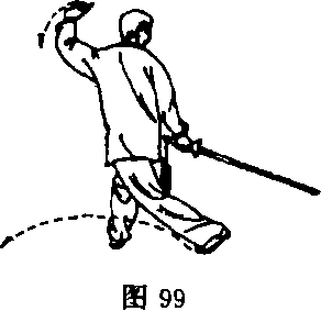 ③随身体重心前移,右脚踏实,左脚跟提起,上体略右转; 同时,右手握剑向右划弧穿挂剑,手心朝外,左手剑指向上,臂 成弧形举于头上方,手心朝左;目视剑尖(图99)。