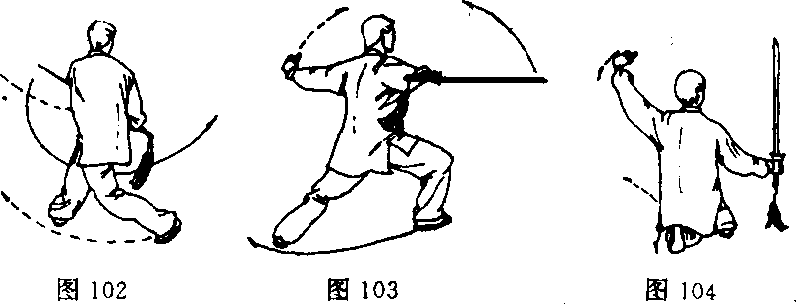 ①右脚跟内扣踏实,屈膝半蹲,左脚跟提起,身体重心前 移,上体右转;同时,右手握剑翘腕向后带剑至右胯旁,手心朝 内,剑尖朝左上方,略低于肩,左手剑指屈肘下落附于右腕上, 手心朝下;目视右前下方(图102)。