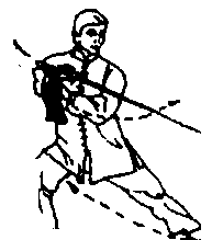心前移,左脚摆 步向前,脚跟着 地,身体略左转; 同时,右手握剑