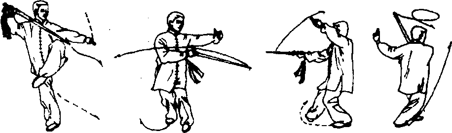 本段包括挂、崩、反刺、提剑4种不同的剑法。其中“提 剑”作法是:右手握剑,剑柄领先,向右、向上划弧提剑;右臂 成弧形举手右前方,腕同额高,虎口斜朝下,剑尖置于左膝外 侧。
