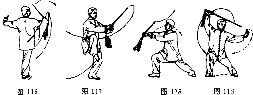 ①右手握剑,前臂内旋经面前使剑尖在头前方逆时针方向划 弧,屈肘向左摆至左肋前,剑尖朝左上方;当右手握剑左摆至面 前时,右脚外摆腿,下落至水平时屈收小腿;左手剑指向上,在 面前与右手相合,屈肘附于右腕内侧,手心朝下;目视前方(图 116、 117)o