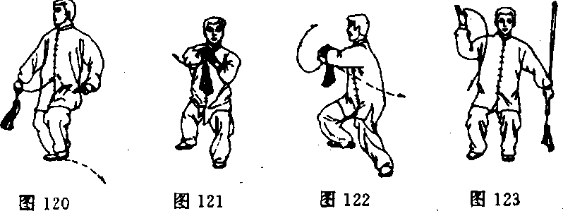 指经左向下收至左胯旁,手心朝下,指尖朝前;目视左前下方 (图 120)o