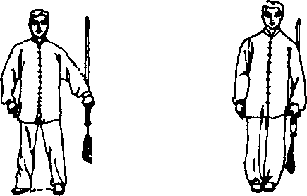 ③两腿自然伸直;同时,右手剑指经胸前向下落于身体右 侧;然后左脚向右脚并拢,身体自然站立,两臂垂于体侧;目视 前方(图 124、125 )0