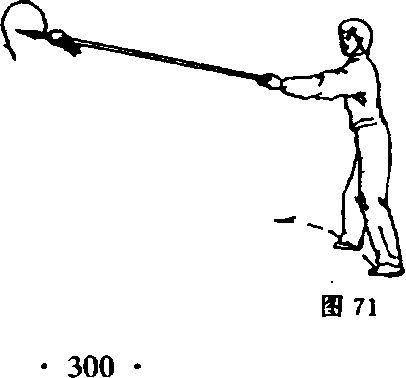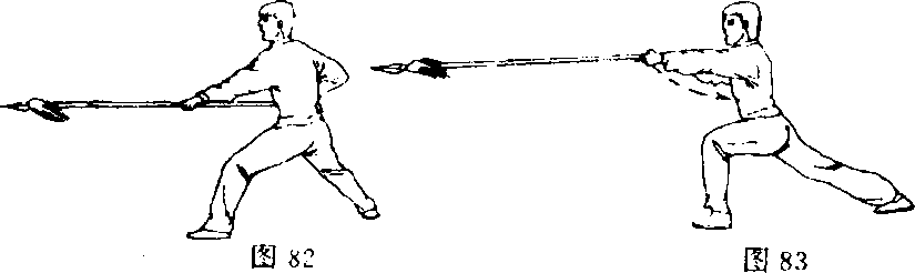 ③重心前移成弓步,右手推送枪把向前扎枪(图83)。