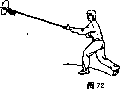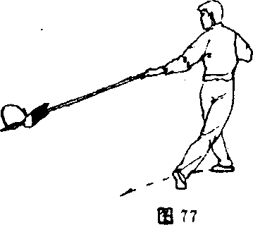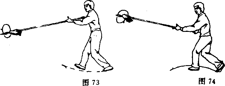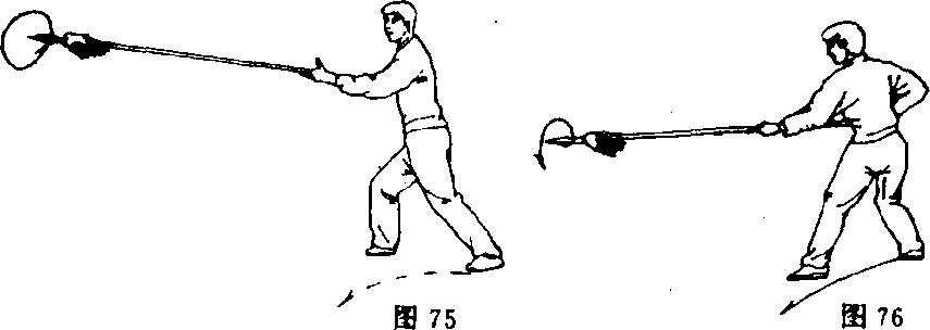 ①左脚向左前方上步;右手握把收于腰右侧(图76)。