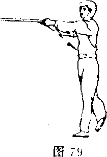 ②右脚向左脚后插步;右手 握把上翻,同时左手持枪外翻拦 枪(图77)。