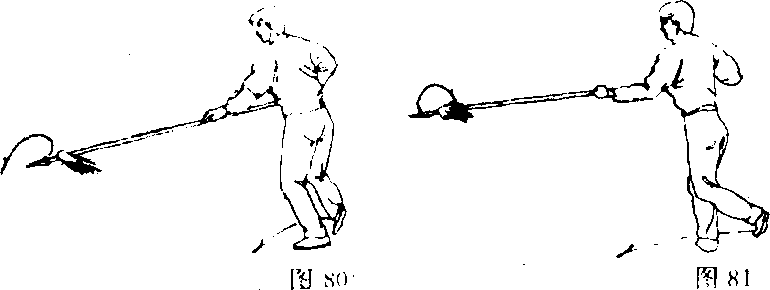 ①重心稍下降,右手抽把至腰右侧,右脚向左脚前盖步;随 即右手握把上翻,左手持枪外翻拦抢(图80、81)o
