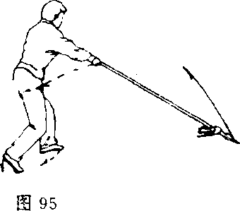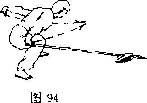 ①重心下降,上体前俯;两手向侧后方分开,右手稍向后拉 枪(图94)。