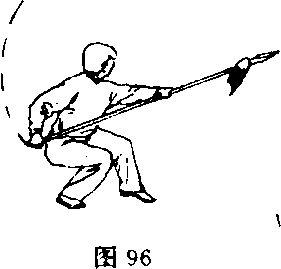 ③右脚实落,右腿屈蹲,左脚向后 收半步成左虚步;同时,左手迅速后抽 枪把,左手向前滑握枪身中段崩枪,枪 尖高与鼻平(图96)。