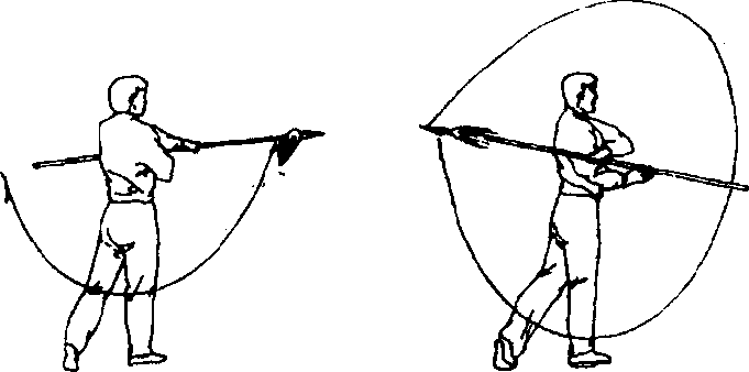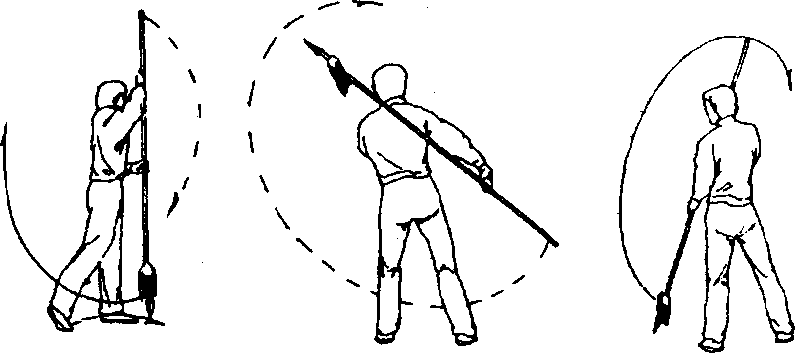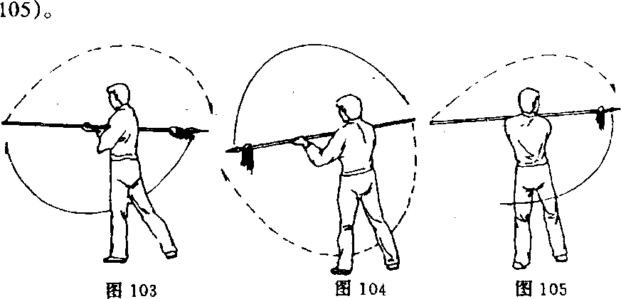 ②随身体先左后右再向左转,做左右立舞花枪三周(图99、 100、 101. 102、 103、 104)。