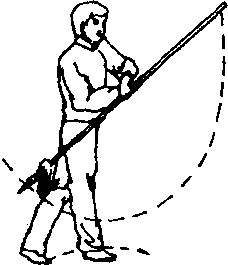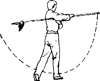 枪随身体右转而运行;枪尖运行到身体前方时,右手松开枪 身,换手下滑到左手的握枪位置;枪身绕向右腋下时,右手手腕 发力的同时,上身前俯,枪身随贯性下降,左手迅速接握枪身, 右手随即握枪把。