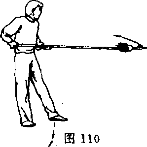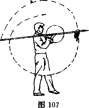 图102图102段使枪尖向右后下方运行(图段使枪尖向右后下方运行(图图106图106②左脚向前 上半步,脚尖点 地;两手持枪使 枪尖继续经上向 前绕转,右手松 开枪身,虎口转 朝把端握枪(图 106. 107)o