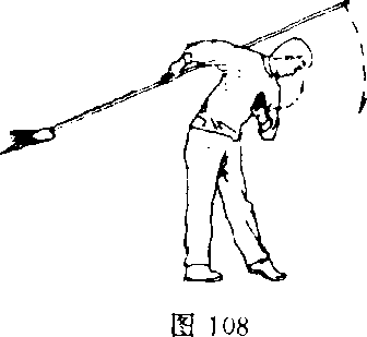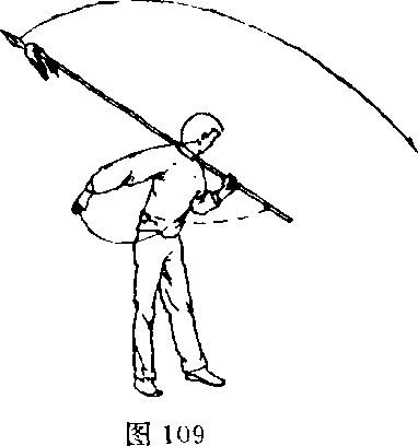 ③左手松开枪身,右手持枪, 前臂外旋,使枪在身体右外侧向前 立抡一周,随后前臂内旋使枪身绕 向腋下,随即上身前俯,右手手腕 发力将枪向上方甩起,使枪身贴背 把端从左肩上向前翻过,左手及时 在身前接握枪身,右手随即接握枪 把(图 108、109、U0)o