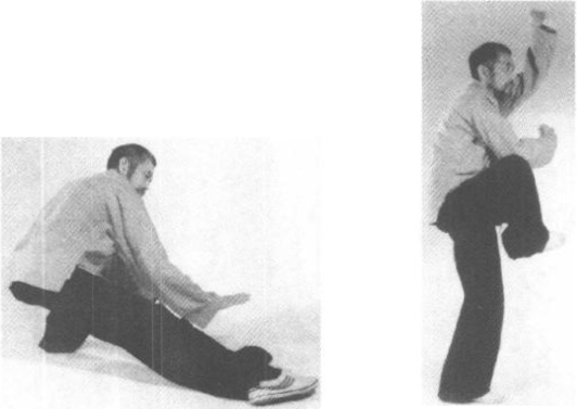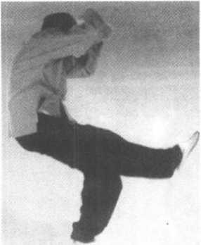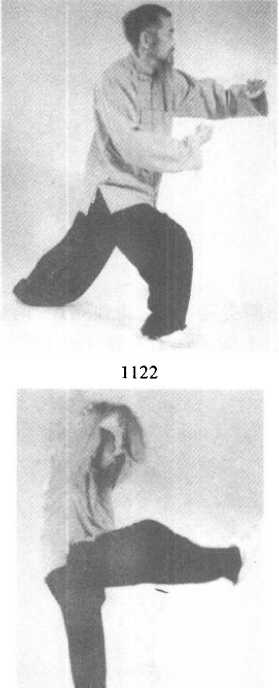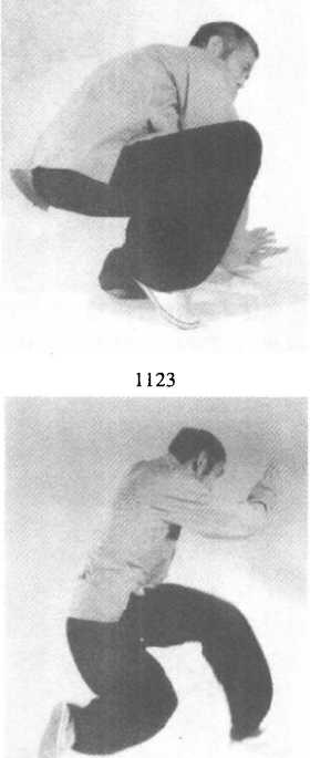 接高探马式,左脚在前收回右脚成虚步,以脚趾点地,双掌左 前45。角拍地助势,以增蓄力,同时腾空跃起,以右踢左蹬之势发 劲(图 1122 ?1126)。11261126随之左脚往后落地,右手随同右脚提起,成左腿独立式,两拳 拳眼相对成直线,两拳虎口均向上,右脚尖尽力上提(图1127- 1128)o11261126