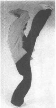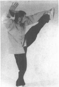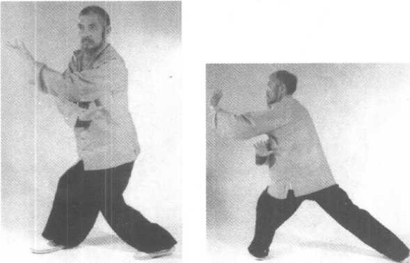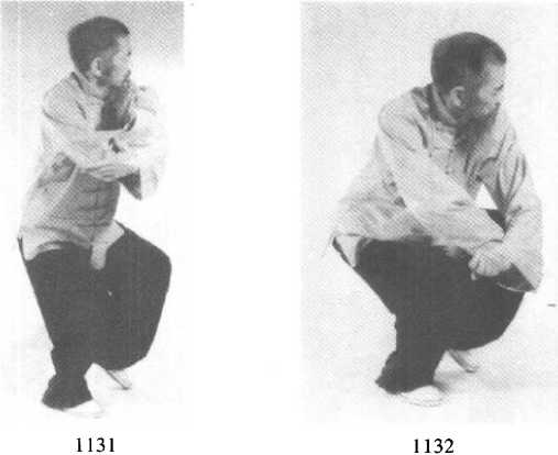 右脚从左 下至上向右划 一大圈至右方 45。角落地成 右弓步,双拳 随体右移相对 于前方额前击 出,两拳眼向 下(图1129- H30)o 左踢脚:1129112911301130要领与前 类同(参照前图以及图1131~1133)。11291129113011301133转身扑面掌:左脚发出踢劲后,左掌随即向前推出同时右掌从右到左在左 掌前伸时从臂下套圈后护于左腰隙,成左弓步(图H34?1135)。