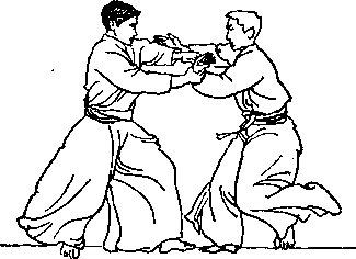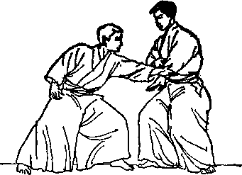 9我方跪坐左手刀截击对方左肩关节右手肘弯夹住对方左手腕贴近胸部并用身体的力量挤压对方的左手臂制服对方(图388)。