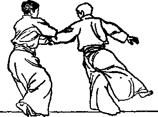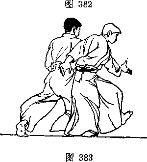 向左方旋转。对方重心被引动无法保持稳定只得跟着我方旋转起来(图384)。