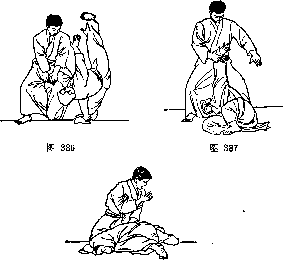 6 我方双手继续抓握对方左手经上方向前下方发出呼吸力,将对方腾空摔出(图386)