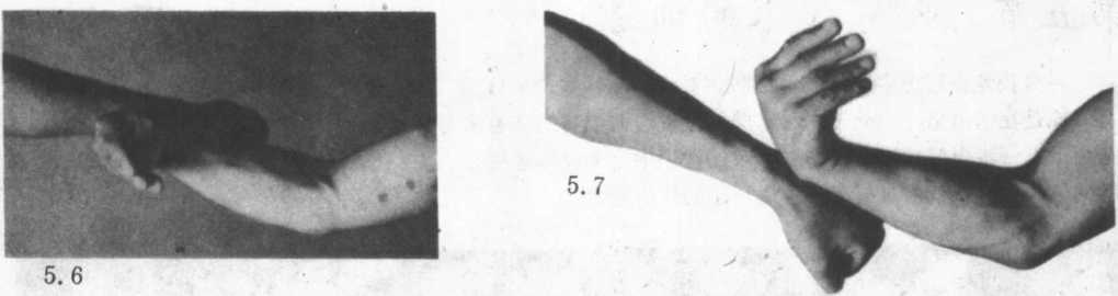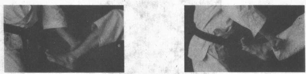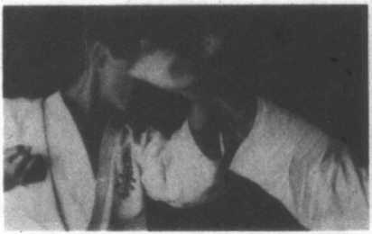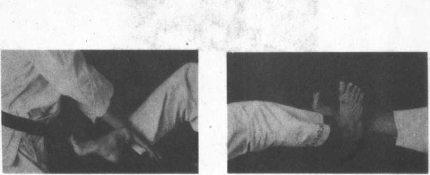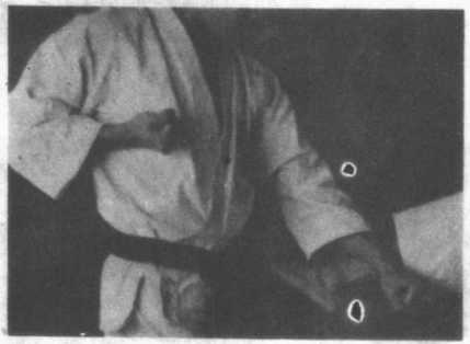 练习四,当对方抬腿前踢时,使前臂内旋 (或外旋)用掌根向下按推&方小腿胫骨达到 防守目的(见图513)。