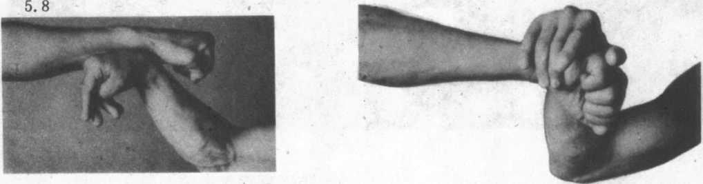 练习九:该练习为抓拿动作,但练习时不 是用手指抓握对方来拳,而是以前臂屈肘用钩 掌封阻对方拳路(见图59)0在运用这一防守 动作时,各手指并没有抓住对方的拳,而只是 用重拍的手法将来拳封住。
