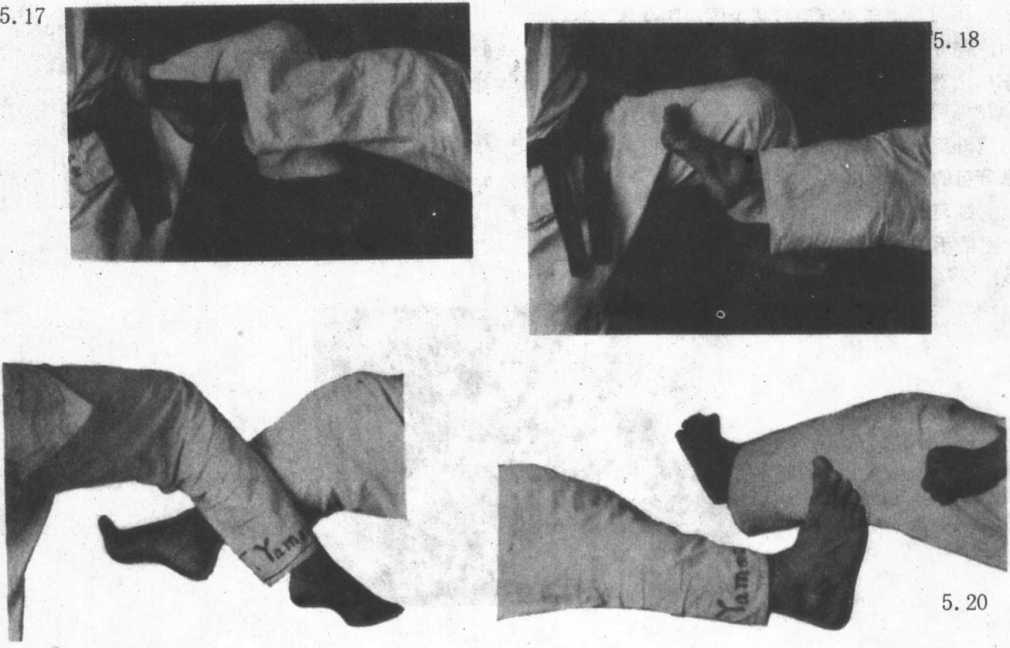 练习七:当对方左腿前抬蹬踹时,防守可 使防守腿屈膝上抬用膝关节内儒面向内扣击对 方前腿胫骨外侧或脚踝关节(见图517—18)0