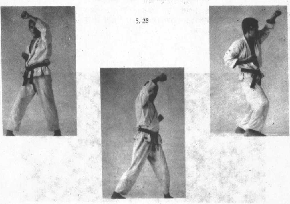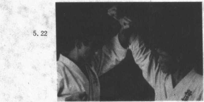 在防守时,其基本姿势是以两腿左右开立 稍宽于肩,两脚前后间距约一脚左右,脚尖向 前(或稍内扣)微屈膝,身体重心置于两腿间 (下述各防守位置类同)。当身体上首受到攻 击时,防守臂屈肘上架封挡,另一臂握拳持于 胸前可随时准备反击(见图522—23)0