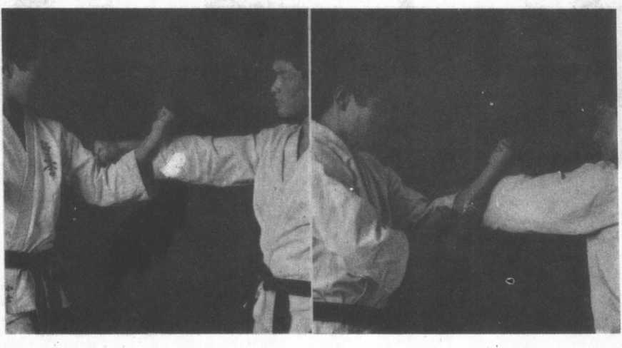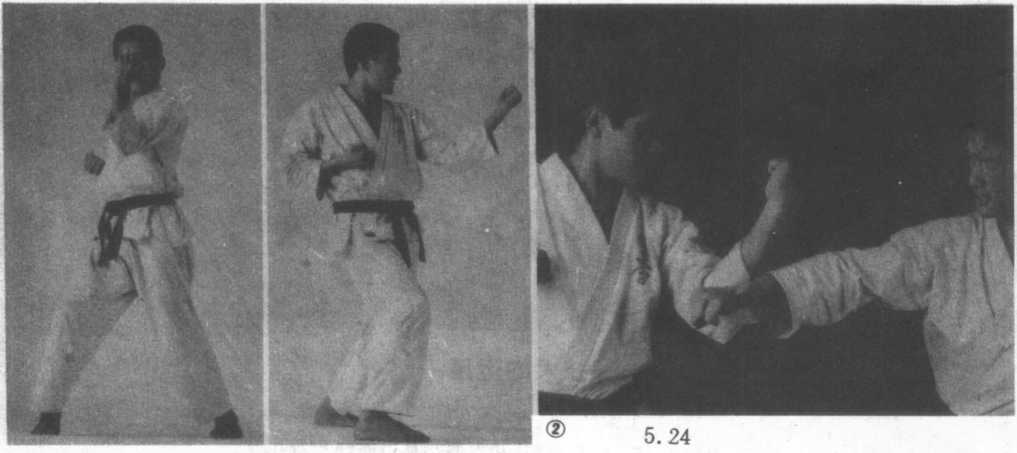 当防守正面直拳攻击时,防守者屈肘用前 臂背侧做内旋动作以磕击的手法由外向内平摆 磕击封阻住对方的直拳攻击(见图524),或用 同样的手法由内向外将封方直拳磕开(见图 525)o