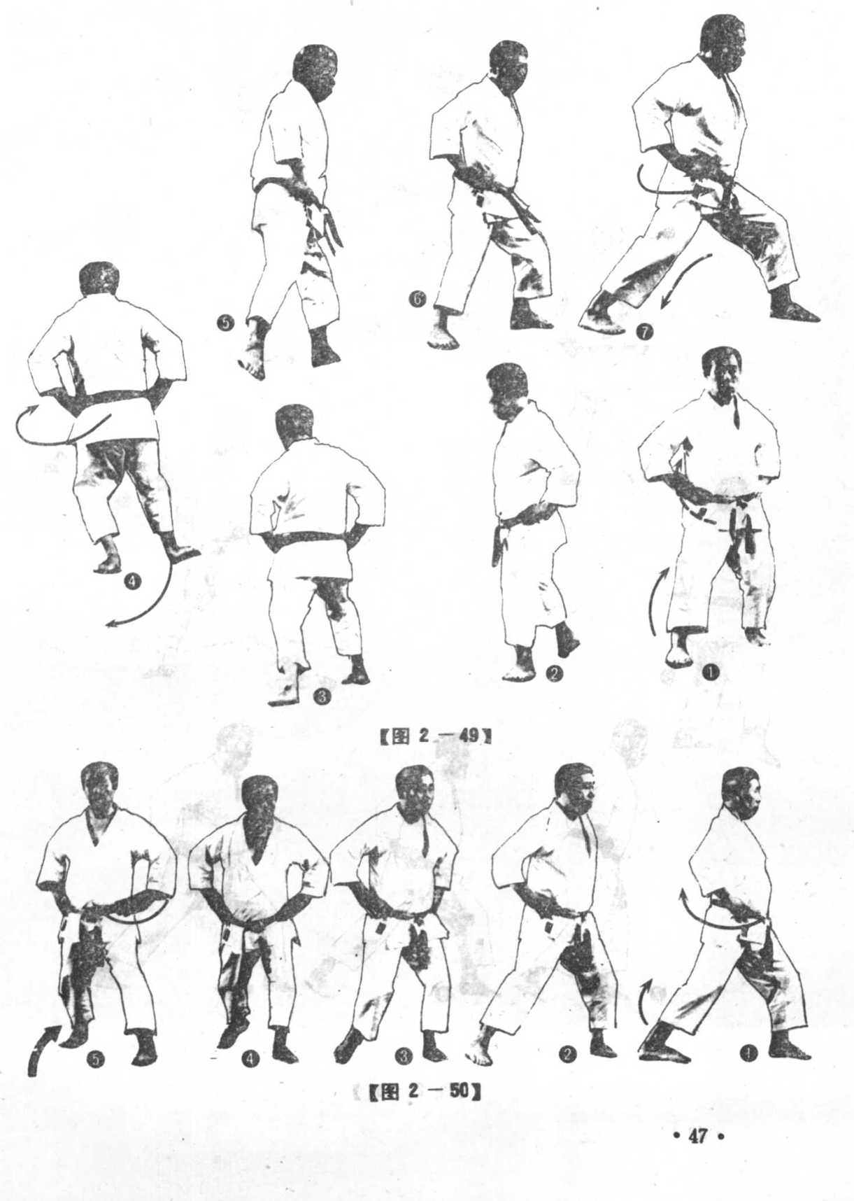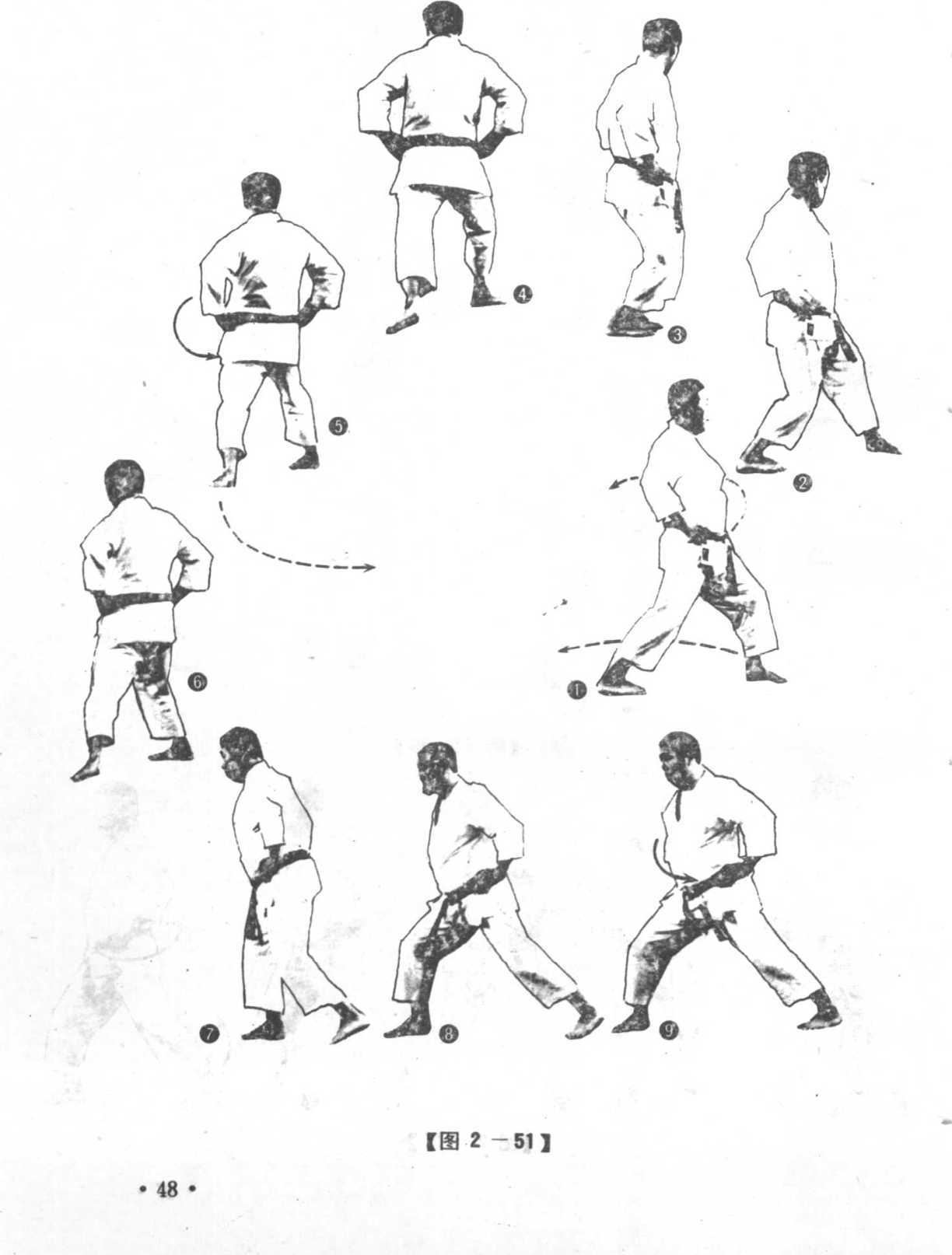 4. 从侧面前弓步转换成正面前弓步,以前脚为轴向右转动。〔图2 -50〕5. 从右侧面左前弓步转换成后面右前弓步,以后脚为 轴向左转动。再以前脚为轴向左转动成左侧面右前弓步。〔图 2 -51〕