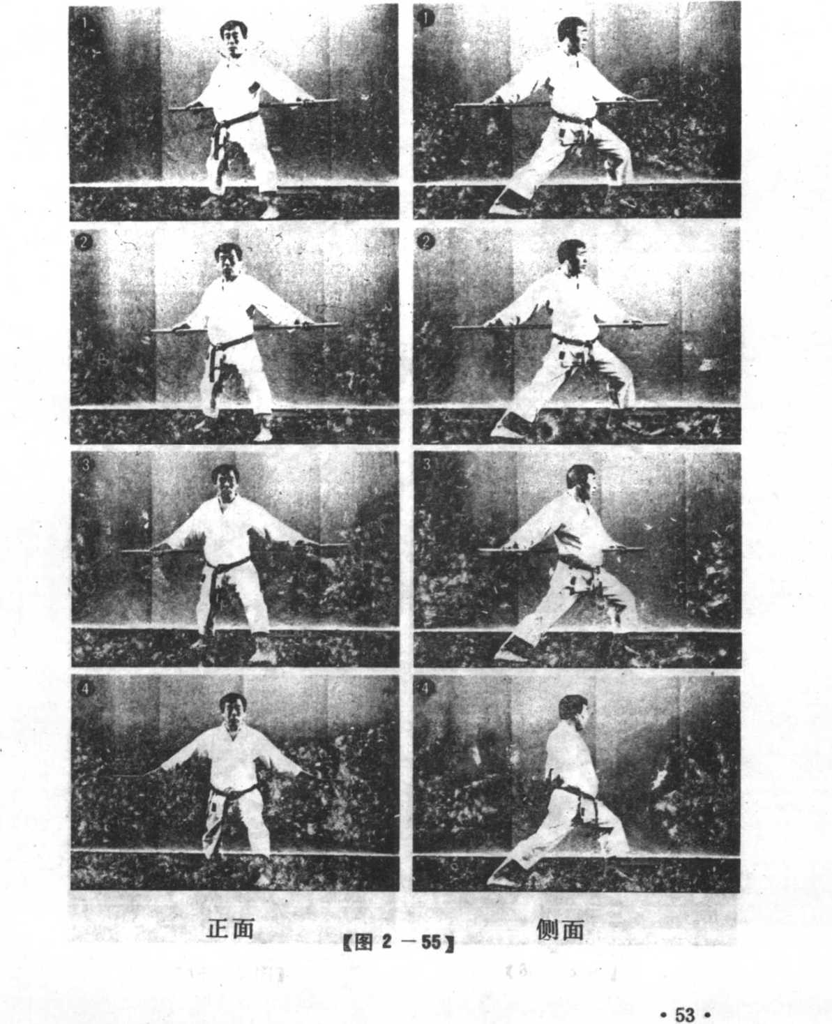 应注意的问题〔图2 -55〕1. 腰部保持水平,才能平稳地旋转。2. 双肩不能扭动,始终保持上身整体转动3. 不要撅臀。4. 前后大腿内侧相互夹紧。用逆向冲拳练习腰部旋转的方法〔图2 -56〕 用劈掌练习腰部旋转的方法〔图2 -57〕用逆向冲拳练习腰部旋转的方法〔图2 -56〕 用劈掌练习腰部旋转的方法〔图2 -57〕