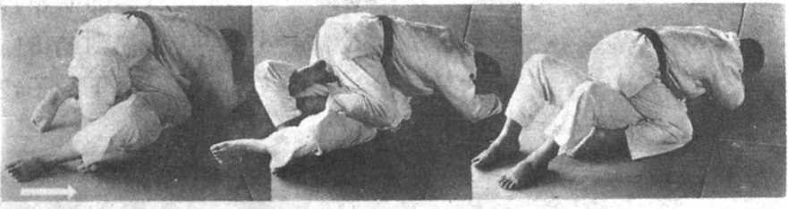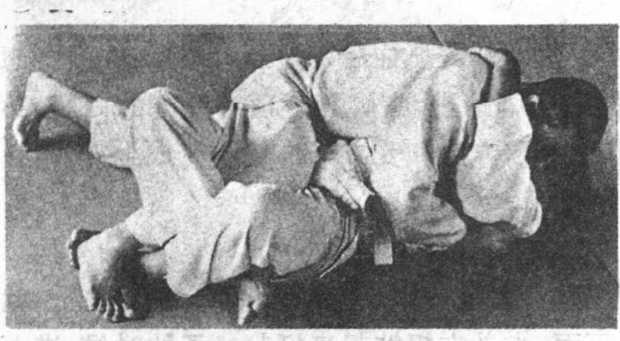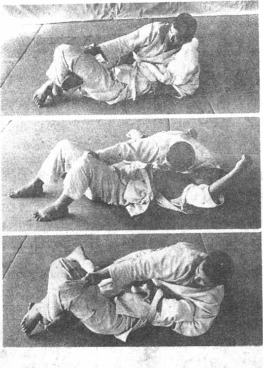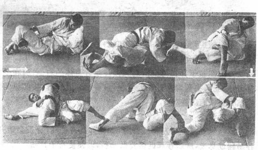脚尖从下方踢开受方的右脚尖,③右脚尖拉到身旁,以免再次被绊 住腿,④因为右膝还被对方夹住,所以要用右拳用力推开受方的左 膝内侧,⑤右手向里伸到受方的左腋下,同时,挺起身子,腰向右扭 转,右膝跪在受方身体的右侧,抽出右脚脖。⑥右脚脖被对方紧紧. 夹住抽不出来时,左脚可用力推开受方的左膝盖,按照崩袈裟固技 的要领将其抱压住。