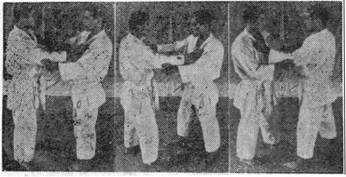 采取自然站立姿势后,双方互相用一手抓握对方衣襟,另一 手抓握对方衣袖外侧中部。开始练习这个基本组合方法后,随着 技术的进步,可根据自己和对方的姿势,身体动作和技巧采取更 为合适的组合方法。