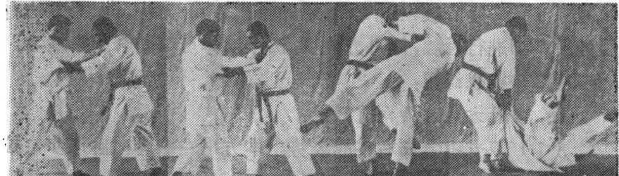 (2)当对方右脚向前迈出的一瞬间,用右脚向斜前迈出, 随之身体左转,两手用力将对方向右前方提拉,使对方失去身体 重心。用基本练习中(3)、(4)的方法用左脚内侧向对方己迈 出的右腿膝部做拦膝动作,?使对方向右前方摔倒。见(图74)